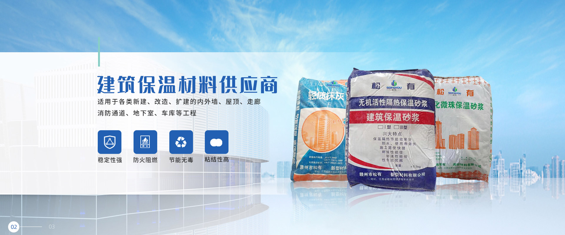 江西松有新型材料有限公司,主要從事保溫材料、防水材料銷售,兼營建筑材料、裝飾材料和金屬材料等銷售,主要產品有巖晶砂、高分子益膠泥、輕質抹灰砂漿石膏、防滲抗裂砂漿、?;⒅楸厣皾{、砌塊砌筑粘接劑、無機活性隔熱保溫砂漿、加氣磚專用砌筑砂漿等。